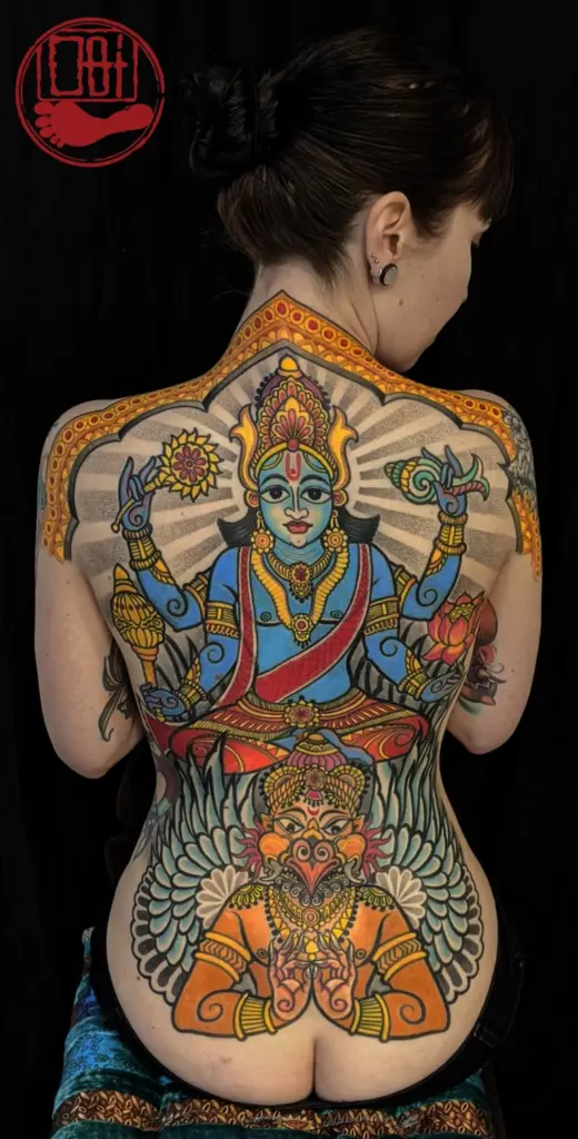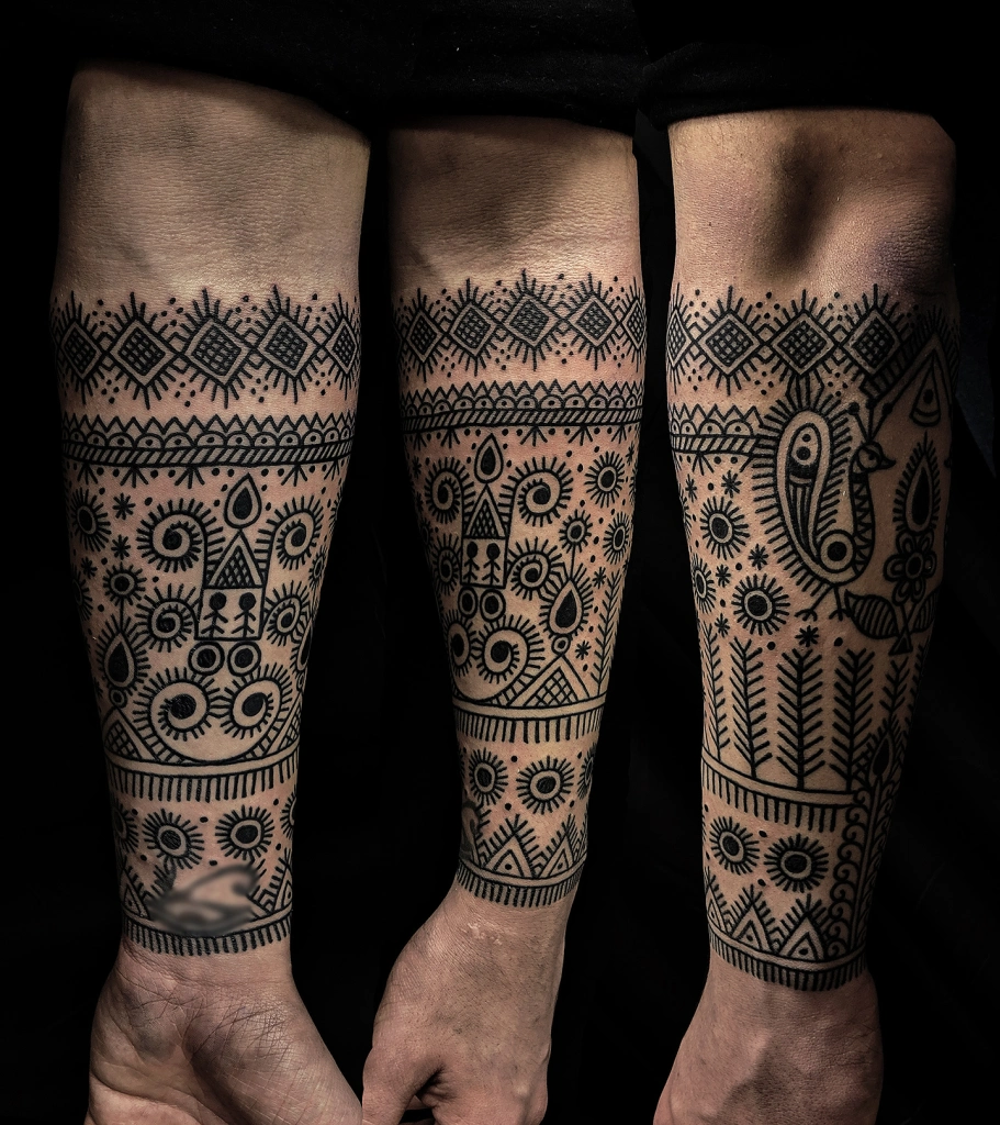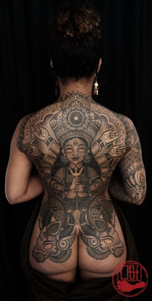 Ich begann, Einflüsse aus verschiedenen bengalischen Kunstformen zu assimilieren und erkannte den unerschöpflichen künstlerischen Reichtum, der in der Tätowierung völlig ungenutzt geblieben war. Aber ich wollte nicht einfach nur kopieren, was bereits existierte, also begann ich, verschiedene Elemente miteinander zu kombinieren. Ein unverwechselbarer Look begann sich herauszubilden, den ich sicher als meinen eigenen bezeichnen konnte. Kurz darauf begann ich, meine groß angelegten Projekte zu komponieren und die Möglichkeiten mit einigen meiner langjährigen Kunden zu besprechen, von denen einige mir vertrauten, ihre Körper radikal mit einem Genre zu verändern, das völlig neu war. Dafür werde ich immer dankbar sein, denn der Bongo-Stil würde ohne das nicht existieren. Es ist immer noch ein Arbeitsprozess; ich verfeinere immer noch verschiedene Nuancen, die einen Stil wasserdicht machen. Dazu gehören Stunden des Studiums der Werke der Meister, das Lesen von Materialien und Geschichte, unzählige Nächte des Zeichnens und Hunderte von Stunden, die Nadel in die Haut zu bringen – alles, um eine Vorlage für die nächsten Generationen zu schaffen, auf der sie aufbauen können und um einen Fußabdruck unseres Volkes, der Bengalen, in der Tattoo-Landschaft zu hinterlassen. Mein Siegel/Stempel ist der eines Fußes; der Alpana-Fußabdruck der Göttin Lakkhi, den ich gesehen habe, wie meine Mutter ihn jedes Jahr während der Puja der Göttin zeichnet. Es ist meine Art, oder unsere Art, anzukündigen, dass wir auch hier sind.