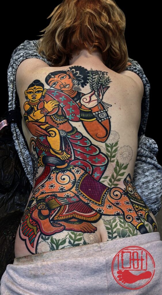 Es ist interessant zu beobachten, wie nahtlos bestimmte bengalische Grundlagen grafischer Bilder, die von Kalighat pata chitra und der grafischen Kunst des frühen 20. Jahrhunderts reichen, und natürlich Werke beliebter Künstler wie Jamini Roy, den Übergang zur Körperkunst in deinen Tätowierungen, insbesondere im Hinblick auf den Bongo-Stil, vollzogen haben. Du bist der einzige Tätowierer, den ich kenne, der dieses uber-lokale kulturelle Paradigma in eine faszinierende Palette verwandelt, aus der er in der Körperkunst schöpfen kann. Wie kam es zu diesem Prozess?